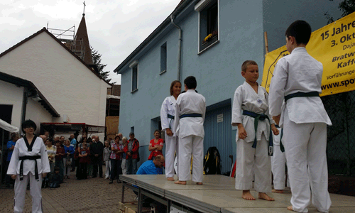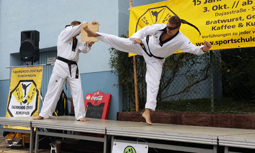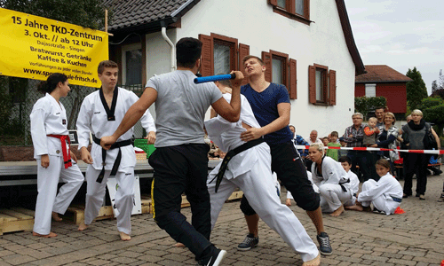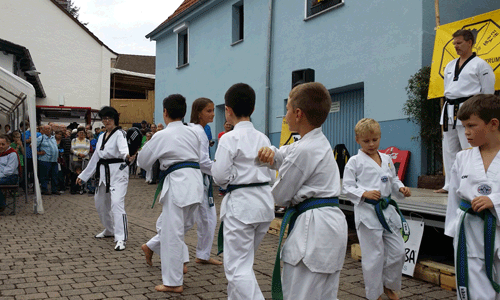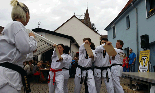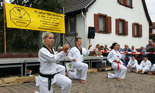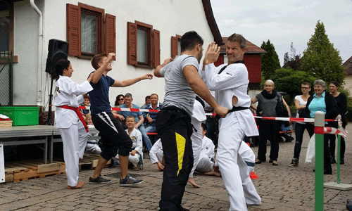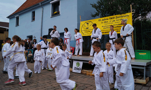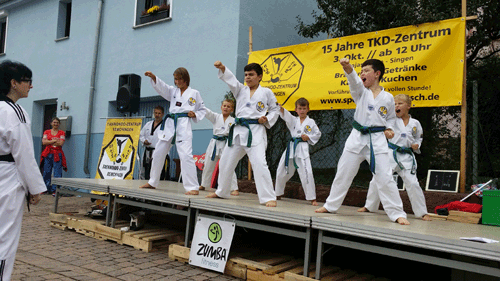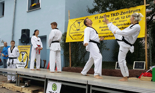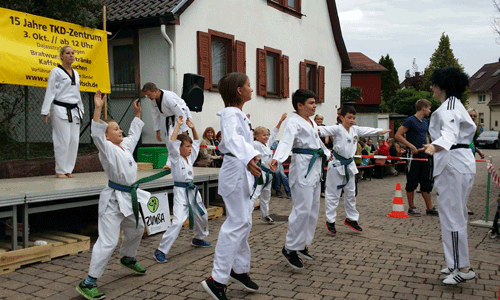 Die Taekwondoka des TKD-Zentrum Remchingen zeigten bei zwei Vorführungen auf dem Singener Straßenfest einen Ausschnitt ihres Könnens. Den Beginn machten die Anfänger und Fortgeschrittenen mit Aufwärmübungen und Grundstellungen des Taekwondo, Selbstverteidigung und Bruchtests.